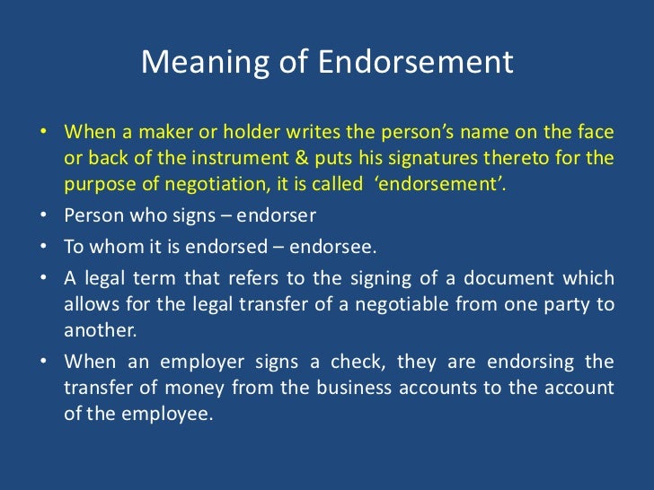 Endorsement Meaning In Negotiable Instruments : An endorsement may be a signature authorizing the legal transfer of a negotiable instrument between parties.